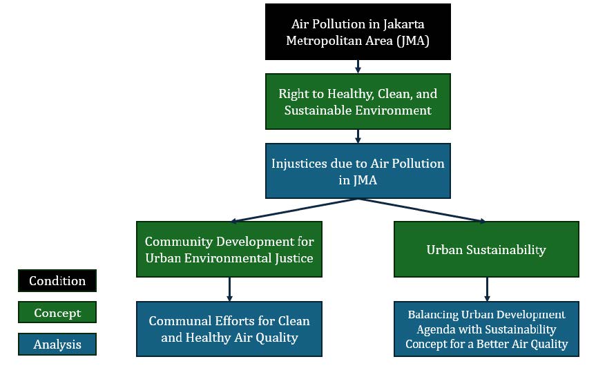 In light of the above, this article focuses on describing and contextualizing the right to a clean, healthy and sustainable environment in the case of urban air pollution in the JMA. How should the community improve access to clean air quality as part of their right to a clean, healthy, and sustainable environment in the JMA? How should urban development in the JMA continue in consideration of urban sustainability and air pollution? In answering these questions, I structure this paper by reviewing some relevant concepts (i.e., the right to a clean, healthy, and sustainable environment, urban sustainability, and community development) that form the analytical framework of the paper. In the second part, I outline the methodology that I use to analyze the problem. The discussion focuses on two issues: community action to realize rights to a healthy air environment in the urban context, and how to reconcile the urban development agenda with the right to a healthy environment for clean air. The final part summarizes the findings and answers the research questions.