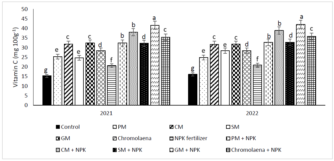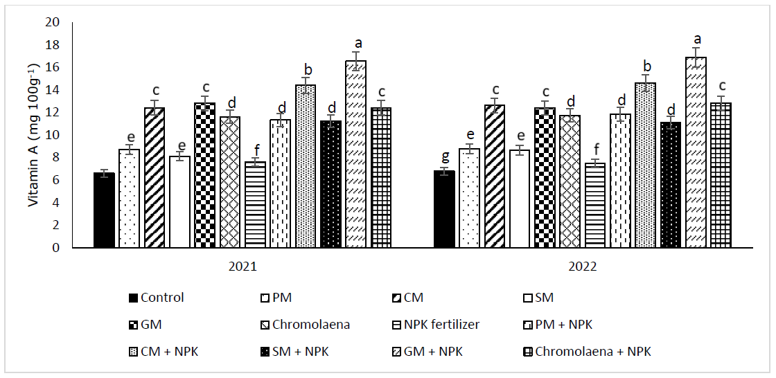 The improved growth and yield of carrots observed when organic manures were combined with NPK fertilizer, compared to their individual applications, can be attributed to the synergistic effects of these nutrient sources. Organic manure not only enhances soil physical properties but also provides a slow-release source of N, P, and K (Ullah et al., 2023). In contrast, NPK fertilizer supplies nutrients in readily available forms. The combination of both ensures that carrot plants have immediate access to nutrients from NPK while benefiting from the continuous nutrient supply and soil structure improvement provided by organic manure. This enhances nutrient retention and reduces the leaching often associated with NPK fertilizers (Adekiya, 2019). Additionally, organic manure helps buffer soil pH (Assefa and Tadesse, 2019), mitigating the acidifying effects of NPK fertilizer. As a result, soil pH in combined treatments tends to be closer to neutral compared to the use of NPK alone. The GM + NPK treatment resulted in the highest carrot root weight, which can be attributed to improved soil physical conditions and optimal nutrient availability. Beyond improving soil structure, the humus formed from the slow decomposition of goat manure (GM), which contains high organic carbon, may also aid in retaining nutrients released from NPK within the root zone (Adekiya, 2019). This retention enhances nutrient uptake efficiency, ultimately leading to higher carrot yields compared to other treatments. The application of organic manures enhances the vitamin A (β-carotene) and vitamin C (ascorbic acid) content in carrot roots by enriching the soil with essential nutrients, including N, P, and K, as well as micronutrients such as Zn and Fe (Adekiya et al., 2022). These nutrients play a crucial role in the biosynthesis of secondary metabolites, including carotenoids (precursors of vitamin A) and ascorbic acid (vitamin C) (Adekiya et al., 2019). NPK fertilizer also increased vitamin A and C levels relative to the control, primarily due to its role in improving leaf chlorophyll content and enhancing photosynthesis, which leads to increased sugar production (Shah et al., 2024). Since vitamin C (ascorbic acid) is synthesized through glucose metabolism (Valdés, 2006), higher carbohydrate production directly contributes to greater vitamin C accumulation. Similarly, β-carotene (a precursor of vitamin A) is produced through photosynthetic pathways (Grune et al., 2010), meaning that increased photosynthesis results in higher carotenoid levels. Among all treatments, the GM + NPK combination resulted in the highest vitamin A and C content in carrot roots. This was attributed to improved soil physical conditions and optimal nutrient availability under this treatment. The beneficial effects of manure and NPK fertilizer in this study on carrot growth, yield, and vitamin content were largely associated with improvements in soil structure rather than solely chemical properties. This study highlights that the combined use of organic amendments and NPK fertilizer can effectively enhance soil quality and boost carrot productivity. By adopting this integrated management approach, farmers in tropical regions can reduce their reliance on expensive chemical fertilizers, making carrot cultivation more sustainable and cost-effective.