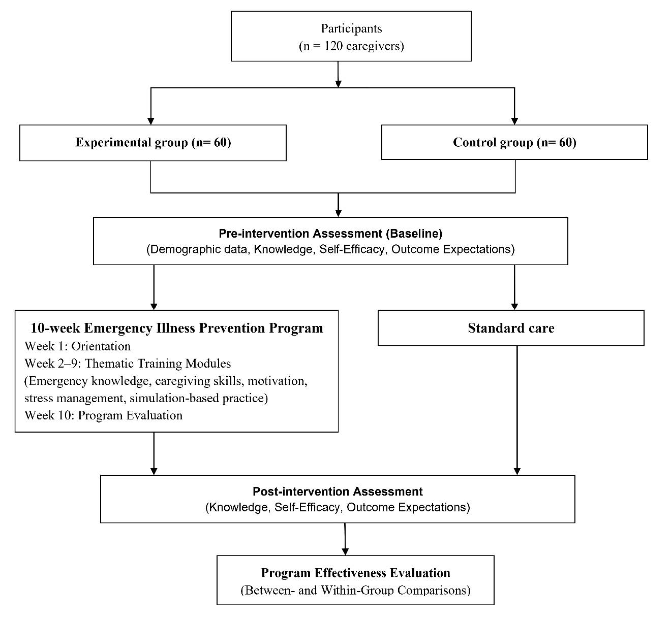 A total of 120 participants were purposively selected and equally assigned to the experimental group (n = 60) and the control group (n = 60). The intervention was implemented over a 10-week period. The control group received standard care based on guidelines routinely practiced in the institution, including routine health education provided by local health authorities, which typically covered basic information on elderly care, nutrition, medication use, and illness prevention. Both groups completed the same validated questionnaires before (pre-test) and after (post-test) the intervention. The flow of the study is illustrated in Figure 1.