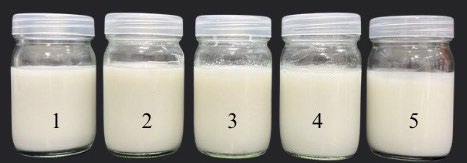 Figure 1. Images of the mangiferin-containing emulsions (F #1-F #5) in glass bottles.