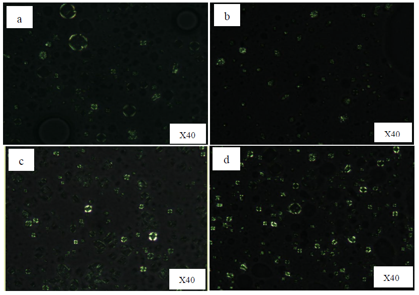 Figure 2. Microscopic images under a light polarized microscopy of a) F #1; sorbitan stearate: sucrose palmitate (3:1), b) F #2; sorbitan stearate: sucrose palmitate (4:1), c) F #3; sorbitan palmitate: sucrose palmitate (3:1), d) F #4; sorbitan palmitate: sucrose palmitate (4:1)