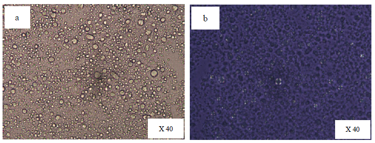 Figure 3. Microscopic images of F #5 containing sorbitan stearate: polyoxyethlene sorbitan stearate (2:1) a) Normal image b) Light polarized image