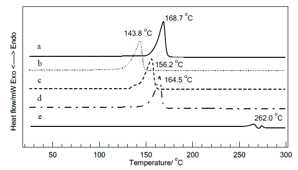 Figure 5. DSC thermatograms of F #4 and F #5, a) F #4 without mangiferin, b) F #4 with mangiferin, c) F #5 without mangiferin, d) F #5 with mangiferin, e) Mangiferin