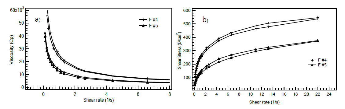 Figure 7. Flow behaviors of F #4 (+) and F #5 (æ) a) Viscosity- shear rate profile and b) Shear stress – shear rate profile.