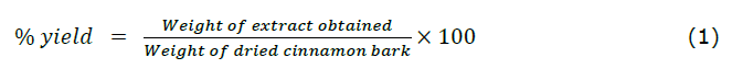 The extraction was performed using the method described by Sukiam et al. (2020) with slight modification. The cinnamon bark was finely ground and macerated in 95% ethanol at a bark-to-solvent ratio of 1:10 at 40°C for 24 hours. The mixture was then filtered, and the filtrate was concentrated using a rotary evaporator (R-300, Buchi, Flawil, Switzerland) to yield the crude extract, which was stored at 4°C until use. The extraction yield was calculated using Equation (1):