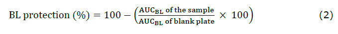 Where AUCBL of the sample and AUCBL of the blank plate are the area under the curve, determined from the transmittance spectra from 400 to 450 nm, and are obtained when the sample is applied and not applied on the PMMA plate, respectively.