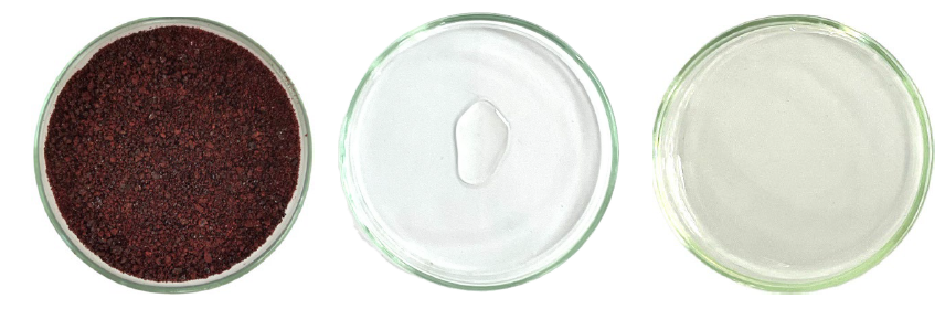 Figure 1. Appearance of Cinnamomum bejolghota bark crude extract (CBE) (left), C. bejolghota bark essential oil (CBO) (middle), and cinnamaldehyde-rich C. zeylanicum bark essential oil (CBO*) (right).