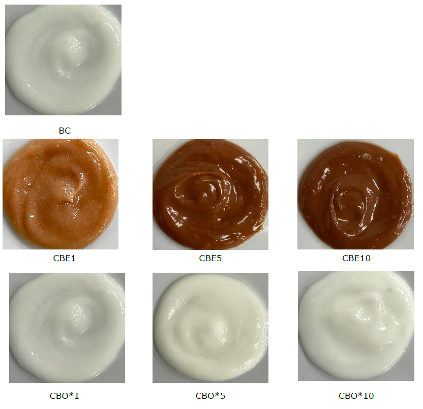 All formulations exhibited uniform consistency without phase separation. The intensity of color deepened with increasing concentrations of extract or oil, particularly in CBE10 and CBO*10.