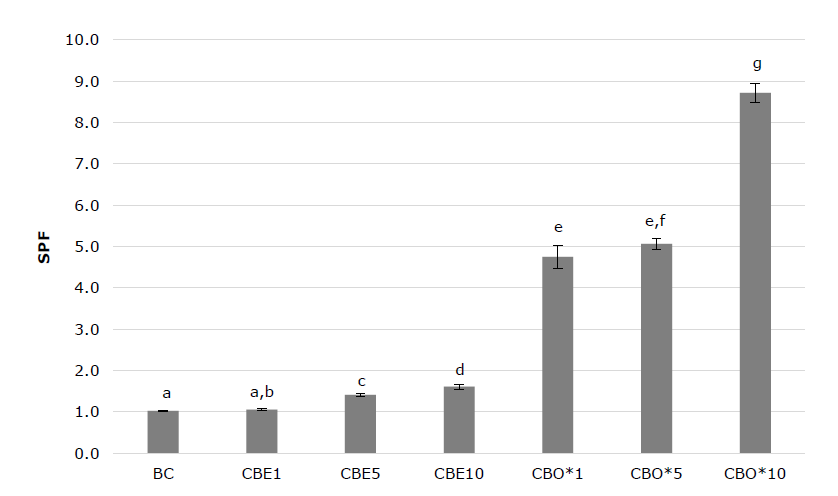 Figure 3. SPF values of base cream (BC) and the sunscreen products containing Cinnamomum bejolghota bark crude extract (CBE) at 1% (CBE1), 5% (CBE5), and 10% (CBE10) by weight as well as cinnamaldehyde-rich C. zeylanicum bark essential oil (CBO*) at 1% (CBO*1), 5% (CBO*5), and 10% (CBO*10) by weight. The results were expressed as mean ± standard deviation (n = 3) and bar graphs with different letters indicate statistical differences at a confidence level of 0.05.