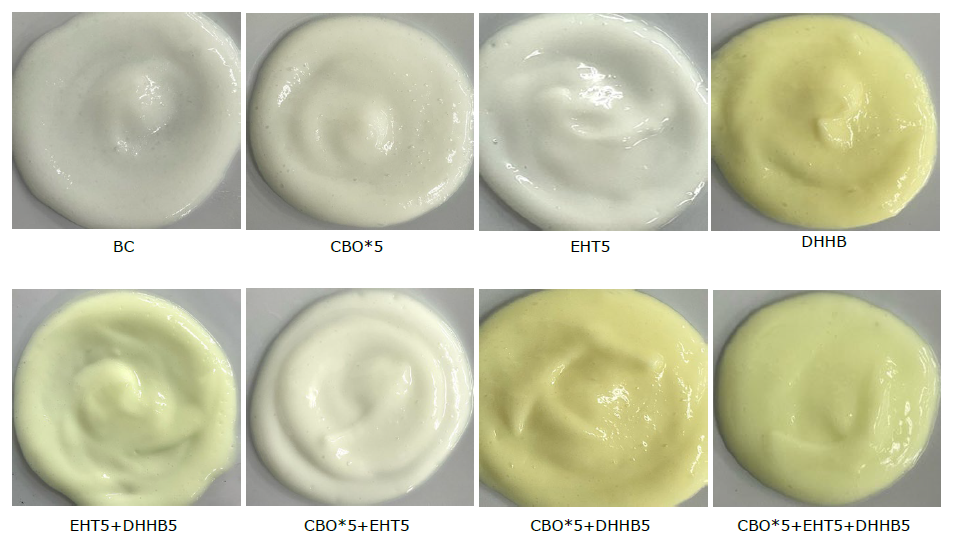 Figure 4. Appearance of the base cream (BC) and the sunscreen products containing cinnamaldehyde-rich Cinnamomum zeylanicum bark essential oil (CBO*5), ethylhexyl triazone (EHT5), and/or diethylamino hydroxybenzoyl hexyl benzoate (DHHB5) at 5% by weight.