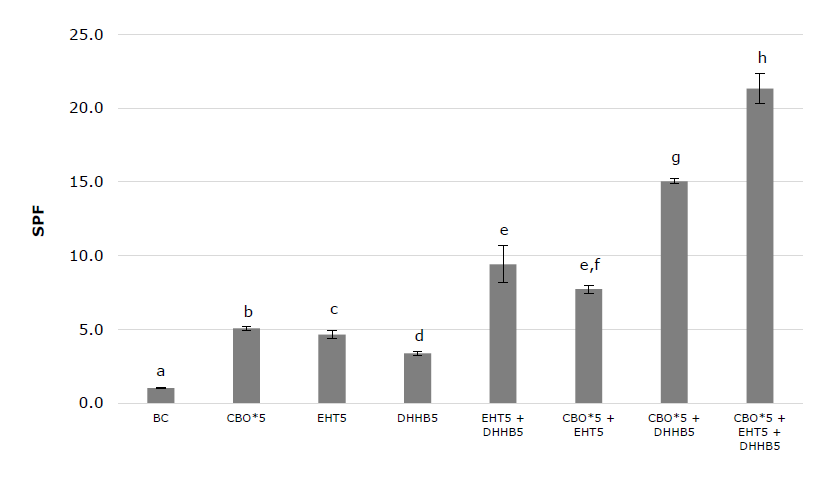Figure 5. SPF values of base cream (BC) and the sunscreen products containing cinnamaldehyde-rich Cinnamomum zeylanicum bark essential oil (CBO*5), ethylhexyl triazone (EHT), and/or diethylamino hydroxybenzoyl hexyl benzoate (DHHB) at 5% by weight. The results were expressed as mean ± standard deviation (n = 3) and bar graphs with different letters indicate statistical differences at a confidence level of 0.05.