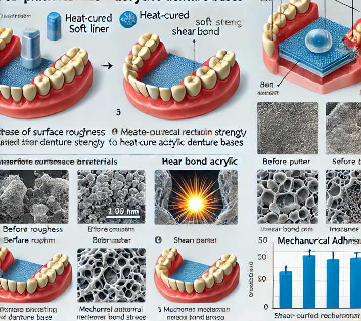 Recent studies have investigated strategies to improve the bond strength of soft liners and relines to denture bases, particularly in 3D‑printed materials. Pereira et al. (2025) demonstrated that 50 µm alumina air abrasion can make the bond strength of 3D‑printed bases comparable to heat‑polymerized ones, while a 180‑second monomer immersion produced the highest bond strength and enhanced resistance to aging after 10,000 cycles. Complementing these findings, Sturzenegger et al. (2025) emphasized that multi-step pretreatment—combining air abrasion with chemical conditioning—optimizes reline bonding in printed dentures. Similarly, Tugut et al. (2024) reported that bond strength varies depending on the denture base material and aging conditions, with conventional, milled, and printed bases showing frequent adhesive failures when no pretreatment is applied. Collectively, these studies highlight that surface conditioning and chemical treatment are crucial for achieving durable bonds, particularly in 3D‑printed denture bases.
