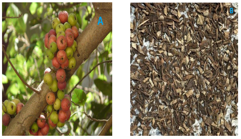 Figure 1. Ficus sur in its natural habitat (A – stem bark and fruits; B – peeled and dried stem bark)