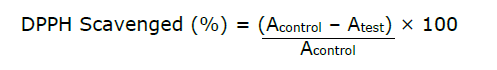 Where ‘Acontrol’ is the absorbance shown by the control (0.05 mg/mL DPPH solution) and ‘Atest’ is the absorbance by the test sample (extract + 0.05mg/mL DPPH solution).