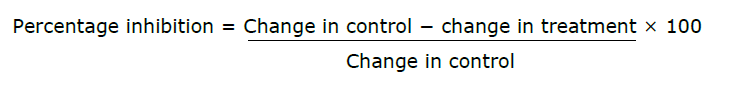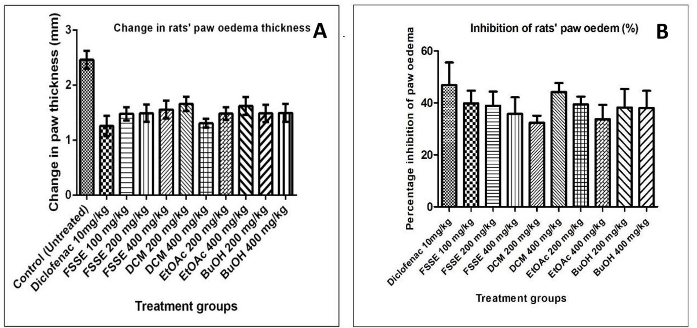 The carrageenan-induced paw oedema protocol, as described by Jia et al. (2005), was utilised. Fifty-five albino rats were divided into eleven groups, each comprising five animals. Group 1 (negative control) was administered 1 mL/kg of normal saline (0.9%). Group 2 received the diclofenac standard drug at a dose of 10 mg/kg body weight, while Groups 3, 4, and 5 were given the extract at 100, 200, and 400 mg/kg body weight, respectively. Groups 6 and 7 were administered 200 and 400 mg/kg body weight of dichloromethane fraction, whereas Groups 8 and 9 received 200 and 400 mg/kg body weight of ethyl acetate fraction. Lastly, groups 10 and 11 were given 200 and 400 mg/kg body weight of n-butanol fraction. Subsequently, 0.1 ml of freshly prepared carrageenan suspension (1% w/v in 0.9% normal saline) was injected into the subplantar region of each rat's right hind paw. The circumference of the rat paw was measured using a vernier calliper immediately before and at 1, 2, 3, 4, and 5 hours after the carrageenan injection. The percentage of oedema inhibition was calculated in comparison to the control group that was administered the vehicle, using the formula: