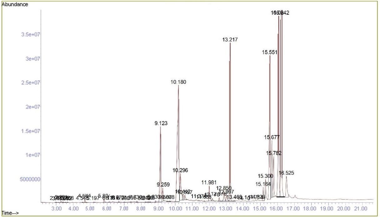 Gas chromatography-mass spectrometry (GC-MS) analysis of F. sur stem bark extract