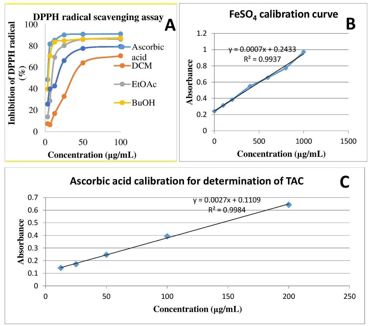 Natural antioxidants in plants play a vital role in inhibiting or preventing the harmful effects of oxidative stress. Antioxidants are essential substances that protect the body from damage caused by free radicals and oxidative stress. The antioxidant activity of the extract and fractions was evaluated using the DPPH, FRAP, and TAC assays. These methods are convenient for assessing the antioxidant potential of medicinal plants. The presence of antioxidant compounds (with hydrogen-donating groups) such as flavonoids and phenols, causes changes like the color shift of the methanolic DPPH solution due to stable, non-radical compound formation; the reduction of Fe3+ to a blue Fe2+ complex in FRAP; and the reduction of MoVI to MoV, resulting in a green phosphate/MoV complex in TAC (Vasudevara and Sravanthi, 2017). The extract and fractions demonstrated significant, concentration-dependent antioxidant activities, as shown in Table 4. The high antioxidant activity observed suggests they contain a substantial amount of polar constituents and antioxidant compounds. Additionally, other secondary metabolites, such as alkaloids and glycosides present in the stem bark extract, have also been reported to possess notable antioxidant activity (Khanal et al., 2022; Hilal et al., 2024).
