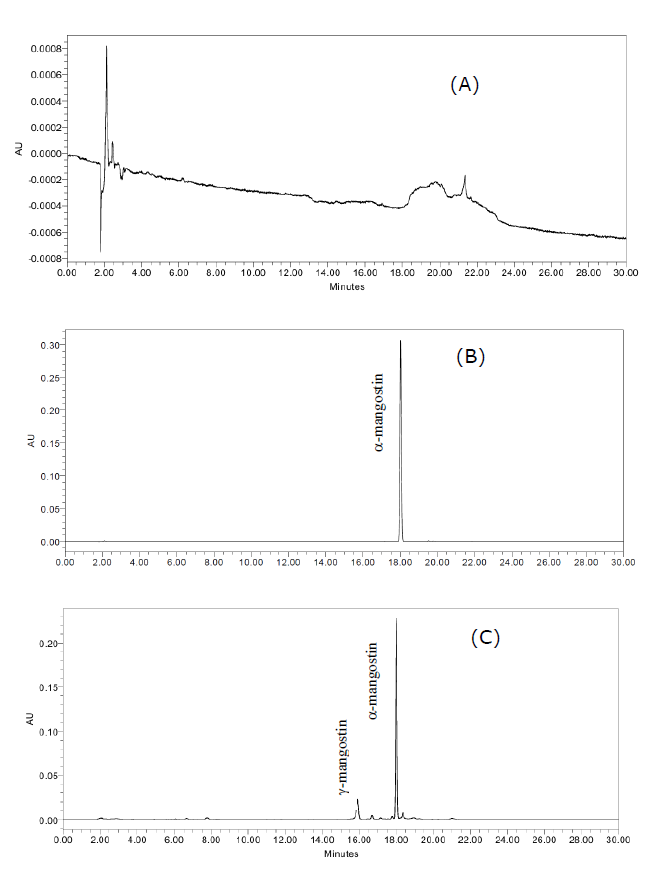 A HPLC method was developed for the quantification of α-mangostin in all five extracts. The HPLC chromatogram of blank (MeOH), standard α-mangostin and G. mangostana extract, using 0.1% formic acid in deionized water and acetonitrile as the eluent, are shown in Figure 1 (A-C). The chromatographic separations under this condition presented good resolution with resolution value of α-mangostin and the nearby peak as 2.56 while chromatogram of MeOH as blank did not exhibit any peak at retention of α-mangostin at 18.0 min. As expected, α-mangostin and γ-mangostin where the major and the second most prominent compounds, respectively (Watanapokasin et al., 2010).