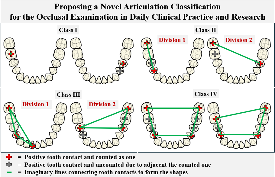 Uthai Uma and Wacharasak Tumrasvin*Abstract Articulation plays a crucial role in dental function, yet existing classification systems lack comprehensiveness, limiting their clinical and research applications. The aim of this study was to propose a new articulation classification to improve clinical practice and research, enhancing the diagnosis and treatment of occlusal problems, ultimately leading to better dental care and patient outcomes. Occlusal contacts were recorded using 8-micron shim stock during static and dynamic jaw movements. All positive occlusal contacts in the lower arch were recorded, then categorized according to articulation classification principles based on tooth contact counts and patterns of occlusal stability. The classification encompasses intercuspal position, centric relation, right/left excursions, and protrusion, introducing articulation ratios as quantitative tools. The proposed classification included four main classes and two divisions: Class I, Class II Division 1, Class II Division 2, Class III Division 1, Class III Division 2, and Class IV. Additionally, articulation ratios were introduced as quantitative tools for further analysis of occlusal issues in relation to other factors. This classification enhances the identification and analysis of occlusal conditions, offering a standardized approach for both clinical and research applications. It facilitates a more precise understanding of occlusal problems.