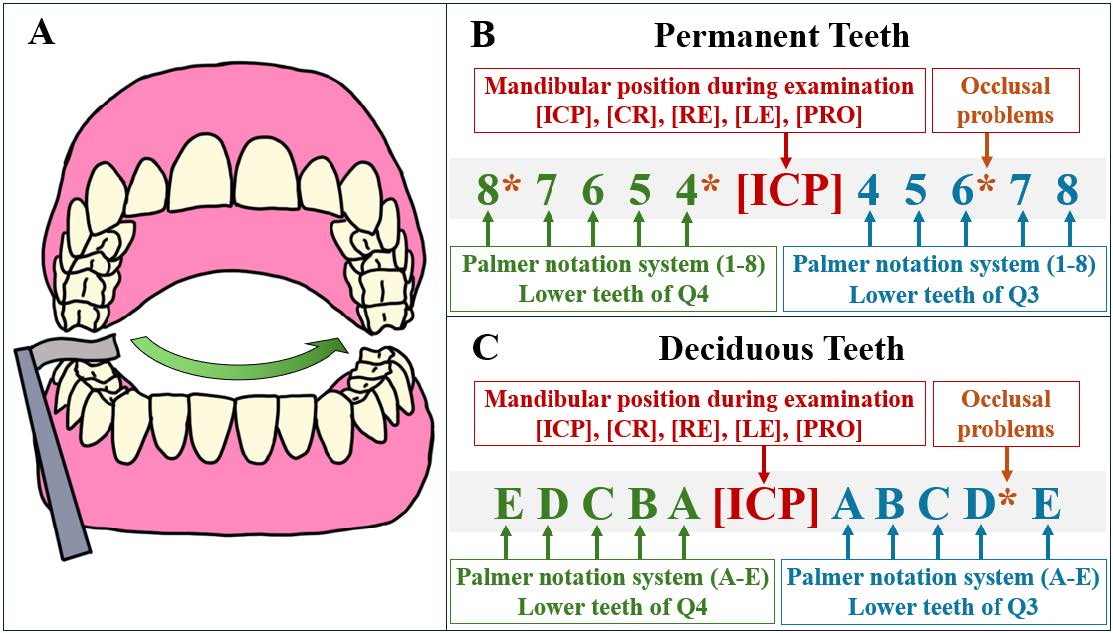 Figure 1. Diagram illustrating the occlusal contact examination and documentation process in dental charts, enabling tooth-by-tooth recording. (A) Occlusal contacts are examined using an 8-micron thin metal foil strip held with articulating paper forceps, starting from the most posterior tooth in quadrant 4 and proceeding to the most posterior tooth in quadrant 3. (B) Documentation involves recording all positive occlusal contacts using a chart based on the Palmer notation system, with numbers 1–8 representing permanent teeth. Recording begins from the last lower tooth to the first tooth in quadrant 4, with mandibular positions indicated in square brackets, and continues from the first lower tooth to the last tooth in quadrant 3. (C) The Palmer notation system, letters A–E, are used for deciduous teeth.