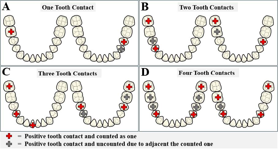 Summarizing the number of counted tooth contacts: Tooth contacts are classified into four types based on the number of lower teeth making counted contacts: 1) one tooth contact, where only a single counted tooth makes contact (Figure 2A); 2) two tooth contacts, where two counted teeth make contact (Figure 2B); 3) three tooth contacts, where three counted teeth make contact (Figure 2C); and 4) four tooth contacts, where four or more counted teeth make contact (Figure 2D).