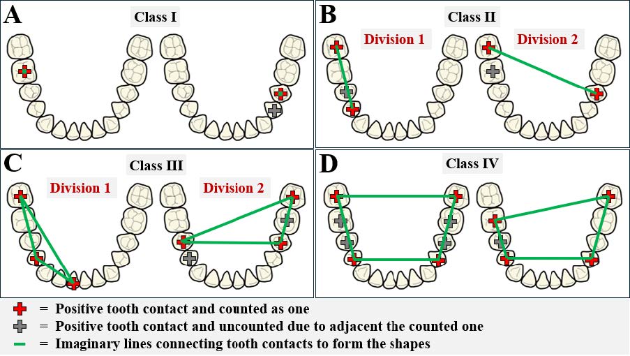 Categorizing the articulation classification: The articulation classification is specified by using "Class" with Roman numerals, e.g., Class I, Class II, Class III, and Class IV. If there are subgroups within any class, 'Division' is used to describe those subgroups, followed by Arabic numerals, e.g., Class II Division 1. There are four classes, and two divisions based on the number of counted tooth contacts and patterns of occlusal stability (Figure 4).